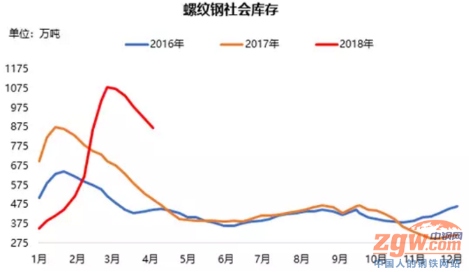 截止4月13日。全國螺紋鋼社會庫存為867.69萬噸,年同比增加235.10萬噸,但已低于2017年峰值的873.68萬噸。從螺紋鋼社會供需關(guān)系表中可見,2018年3月中旬過后,供需出現(xiàn)了罕見的差值,其根本原因在于環(huán)保力度的加大及延遲需求的釋放。就目前情況來看,