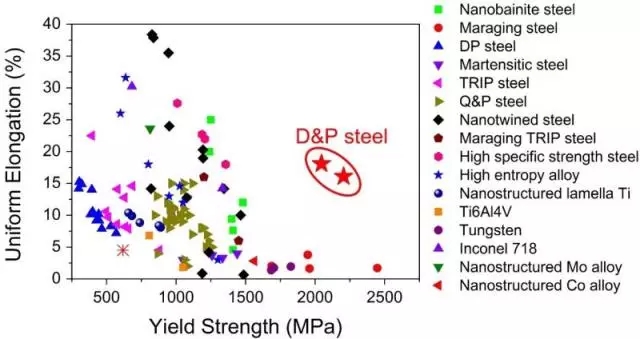 圖1 D&P鋼與其它金屬材料的強度和延展性的對比,其具有最優(yōu)的強度和延展性的結(jié)合。