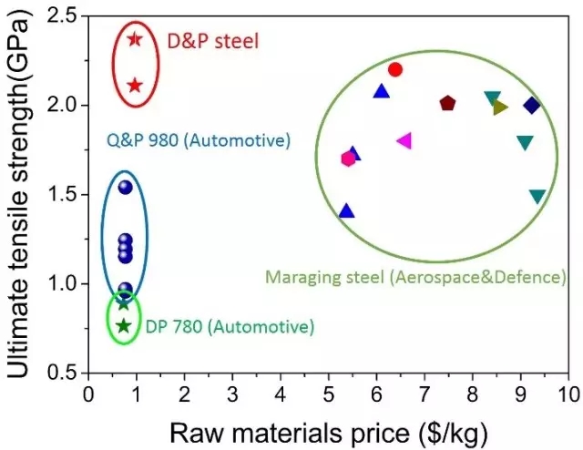 圖2 此次發(fā)明的超級鋼(D&P鋼)與其它鋼鐵材料原材料成本比較。