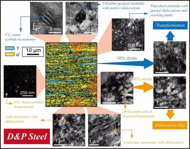 圖3 (a)電子背散射衍射(EBSD)相圖展示了D&P的片層狀結(jié)構(gòu),其中奧氏體(g)嵌入在回火馬氏體(a')中。(b)透射電子顯微鏡(TEM)圖片放大顯示了馬氏體中的位錯結(jié)構(gòu)。(c)TEM圖片展示了馬氏體中的位錯結(jié)構(gòu)在8%拉伸變形后明顯變長。(d)TEM圖片證實了奧氏體在拉伸至16%的應(yīng)變過程中相變成了馬氏體。